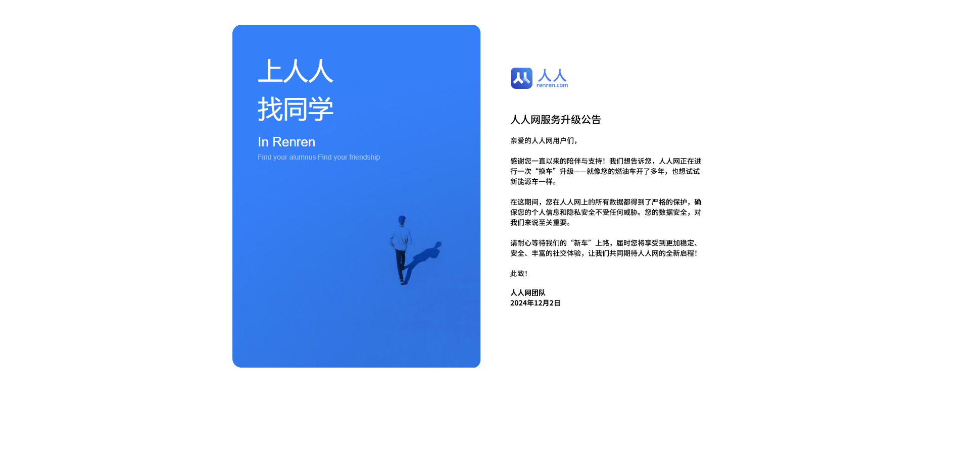 請耐心等待我們的“新車”上路,屆時您將享受到更加穩定安全、豐富的社交體驗,讓我們共同期待人人網的全新啟程!